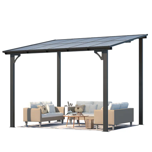 Wall-mounted lean-to gazebo with a sleek black finish adds elegance to any outdoor setting.