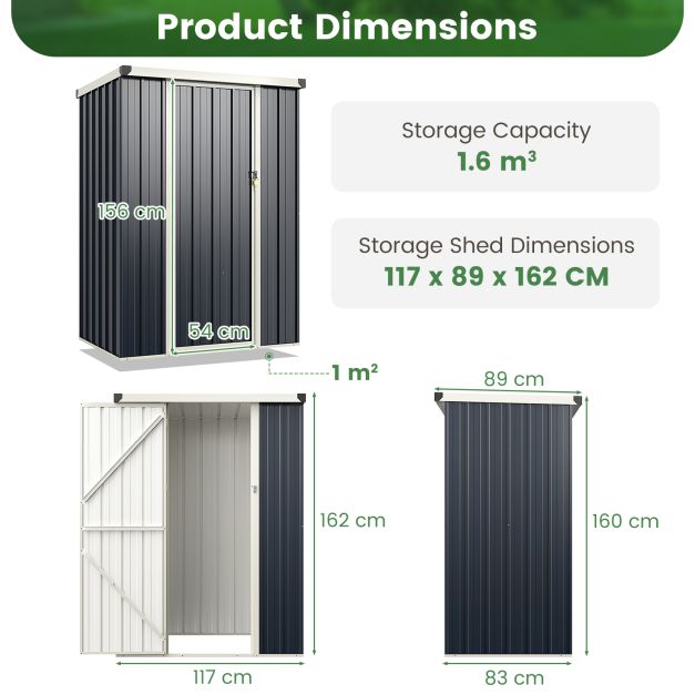 Spacious Space and Lockable Design: The metal garden shed measures 117 x 89 x 162 CM (L x W x H) and the storage capacity is 1.6 m3, providing convenient storage for various gardening equipment and tools, which could keep your yard or garden clean and tidy. Besides, it is equipped with a lockable door for added safety.
