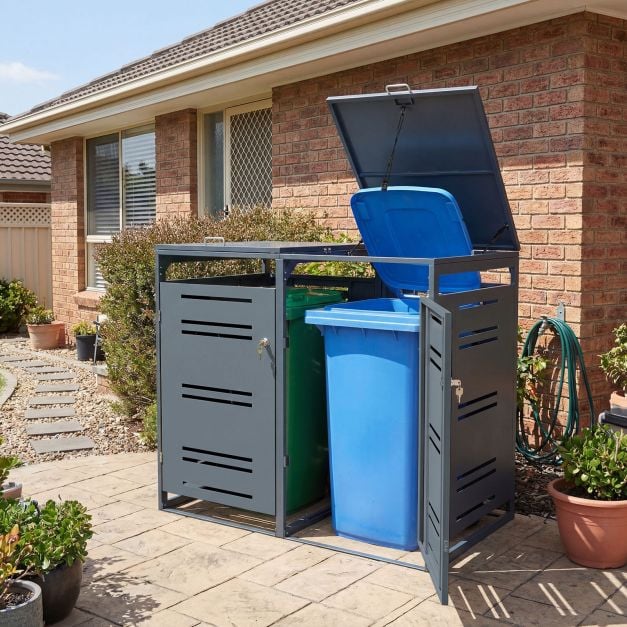 Contemporary dark grey wheelie bin store with space for two 240L bins