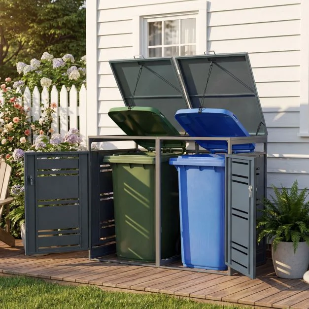 The dual-bin layout supports organized waste storage, while gas-strut lids allow smooth and quiet opening for daily disposal. The lockable front doors make it easy to move bins in and out while keeping contents safely enclosed. In addition, this bin storage shed fits naturally into garages, gardens, patios, and yards, ensuring both function and style for long-term indoor or outdoor use.