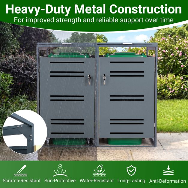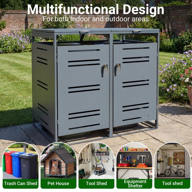 Heavy-Duty Metal Construction: This outdoor bin shed is built from galvanized steel panels and reinforced metal tubing, providing exceptional resistance to deformation, scratches, and daily outdoor wear. It effectively shields bins from sun, rain, and animals, while keeping its exterior clean and tidy.