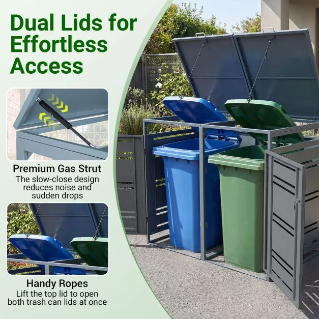 Lockable and Convenient Design: The 2 front doors of this outdoor trash can shed are secured with a key-lock handle for reliable protection of the contents inside. For added convenience, it features practical rope hooks, just lift the top lid to open both bins lids at once, enabling quick and hands-free waste disposal.