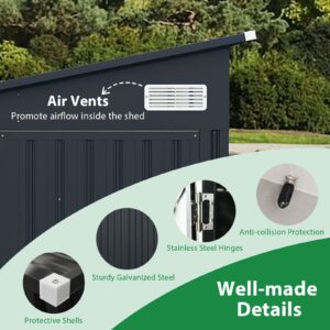 Heavy-duty Structure: Reinforced with galvanized steel panels and an anti-collision cover, this sturdy storage shed ensures the safety and security of your belongings. Moreover, the stable frame, along with reinforced triangle anchors, offers unmatched durability and stability.
