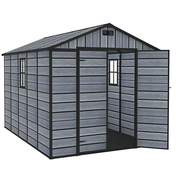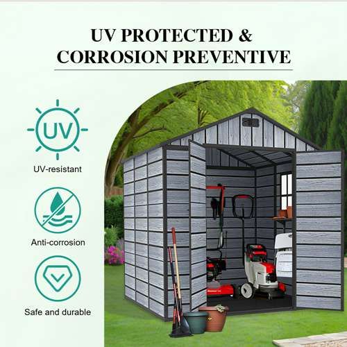 Craft from High-Density Polyethylene (HDPE) the Pro-Tect 8’x10′ Plastic Garden Shed with Integral Floor – Wood Grain is designed to protect your valuables with a weather-resistant enclosure, shielding your items from rain, snow, and the elements?ideal for garden outdoor storage.