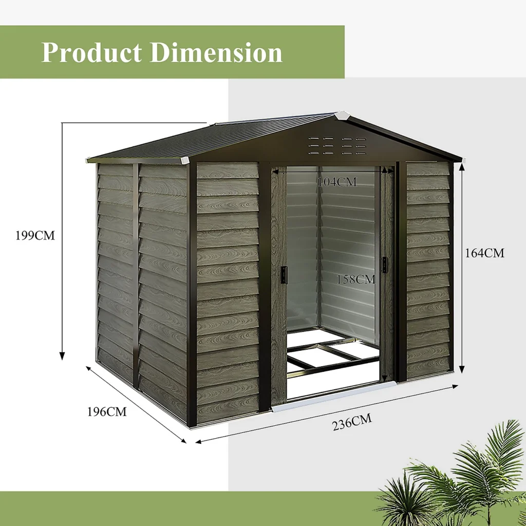 Large Storage Capacity: This garden storage shed is 8x6ft, large internal storage space can accommodate a variety of items, it’s an ideal storage shed for lawn mower, grill, bicycles, garbage bin, garden furniture and garden tools.