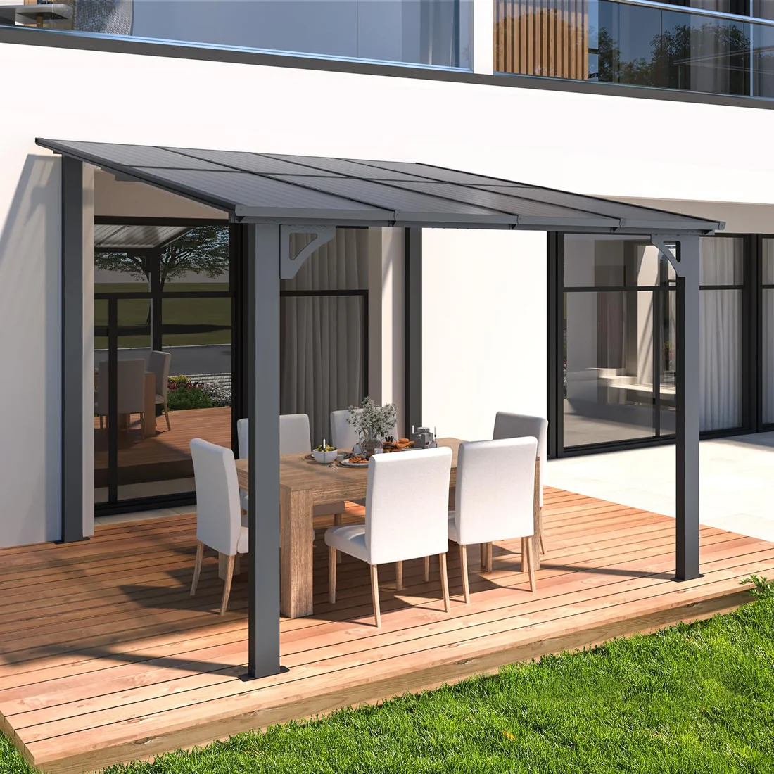 Wall-mounted lean-to gazebo with a sleek black finish adds elegance to any outdoor setting.