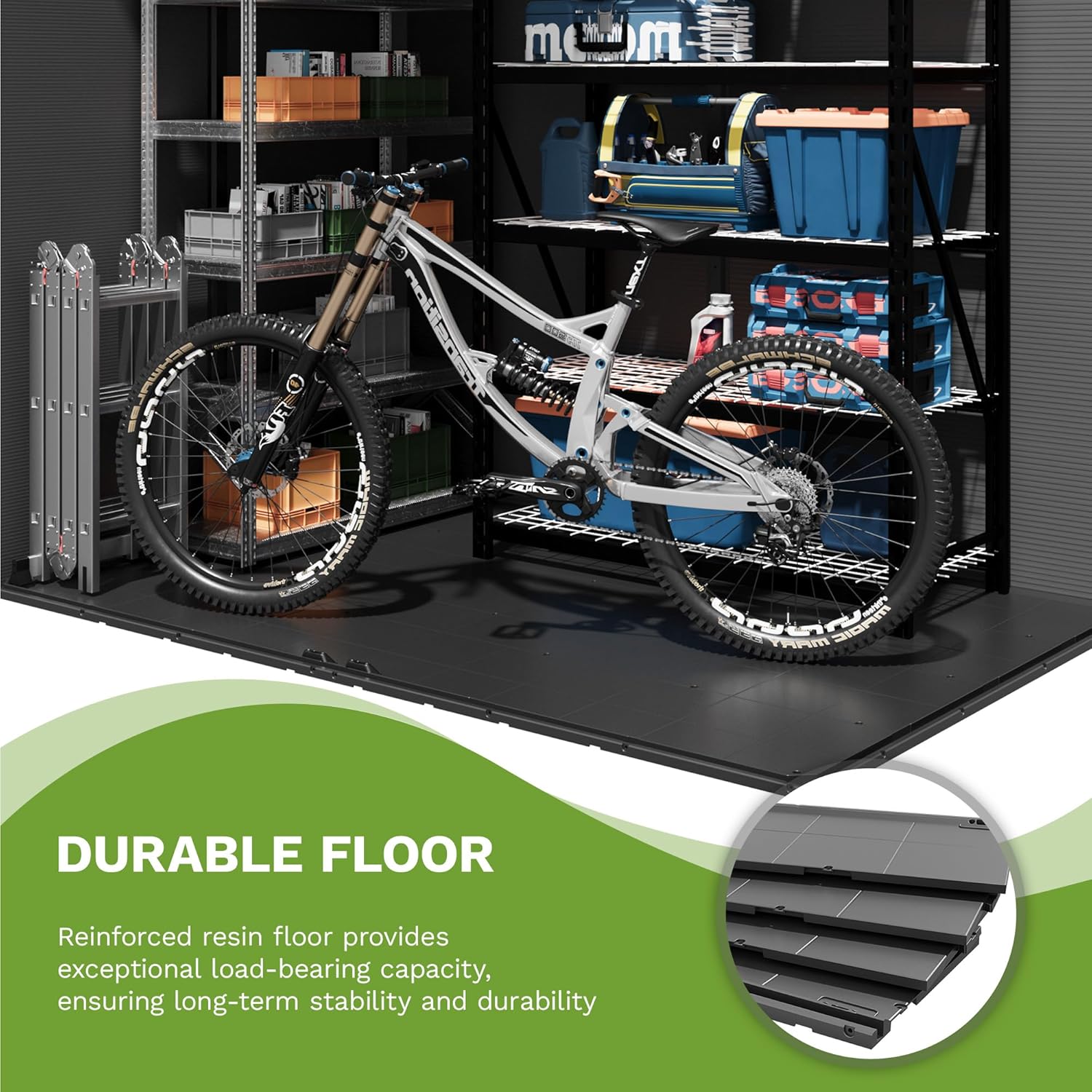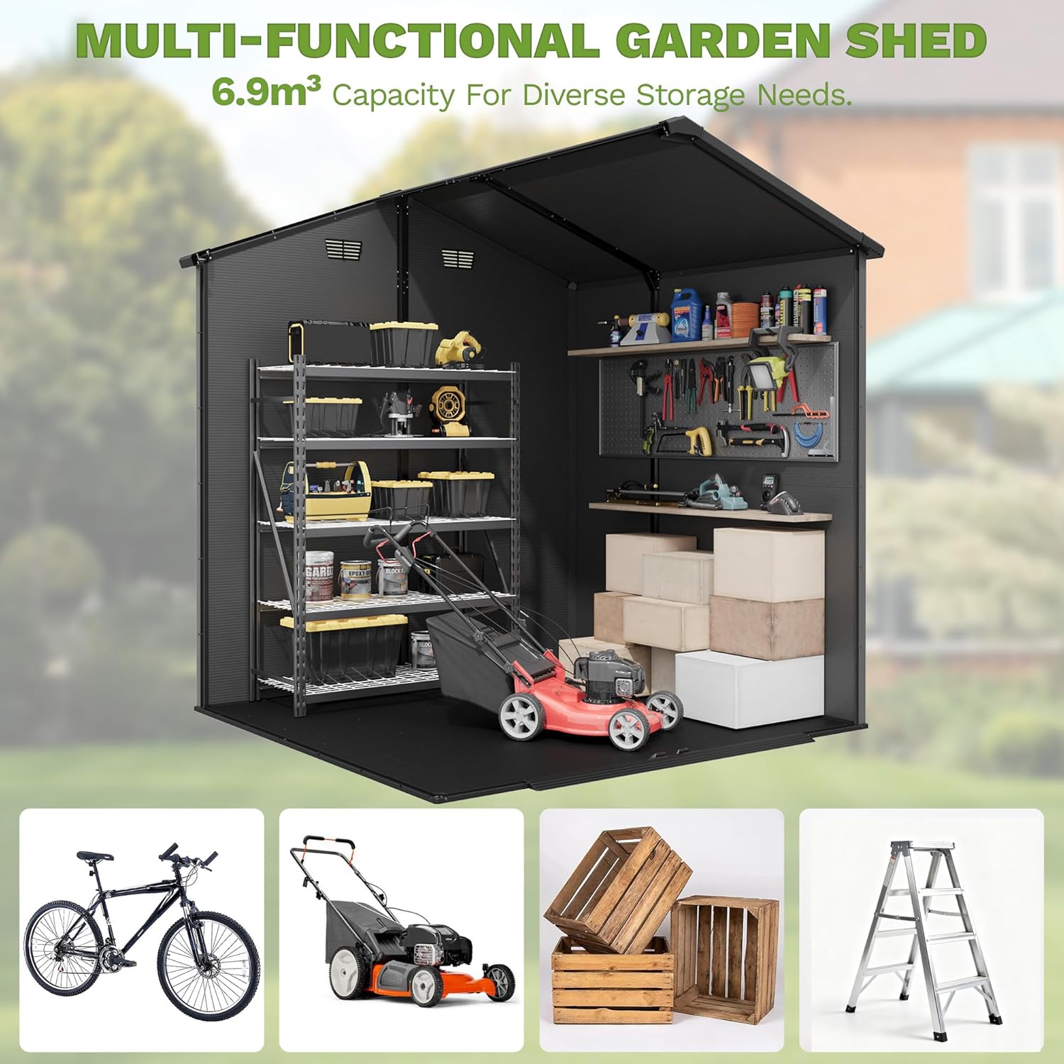 This generously sized shed is the perfect solution for a clutter-free garden, patio, or backyard, effortlessly storing everything from gardening tools and lawnmowers to bicycles, ladders, and shelving units.