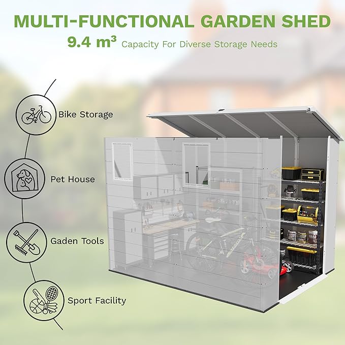 This generously sized shed is the perfect solution for a clutter-free garden, patio, or backyard, effortlessly storing everything from gardening tools and lawnmowers to bicycles, ladders, and shelving units.