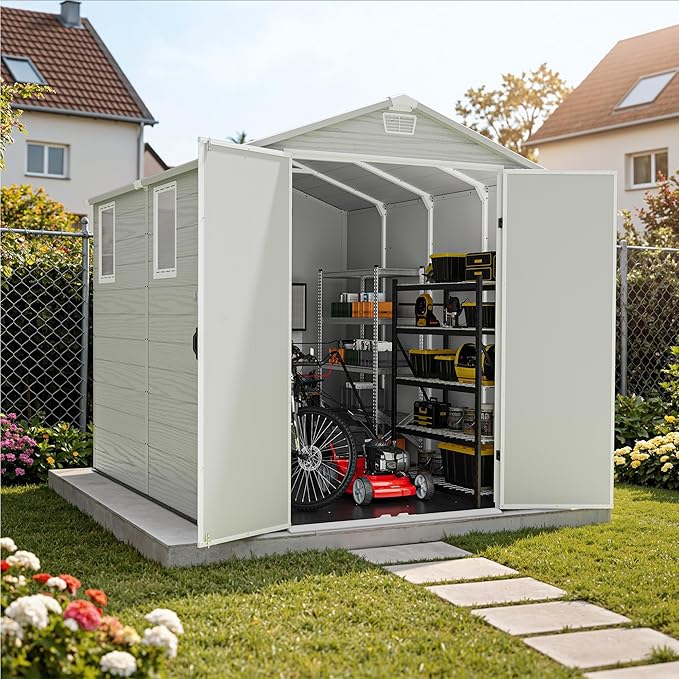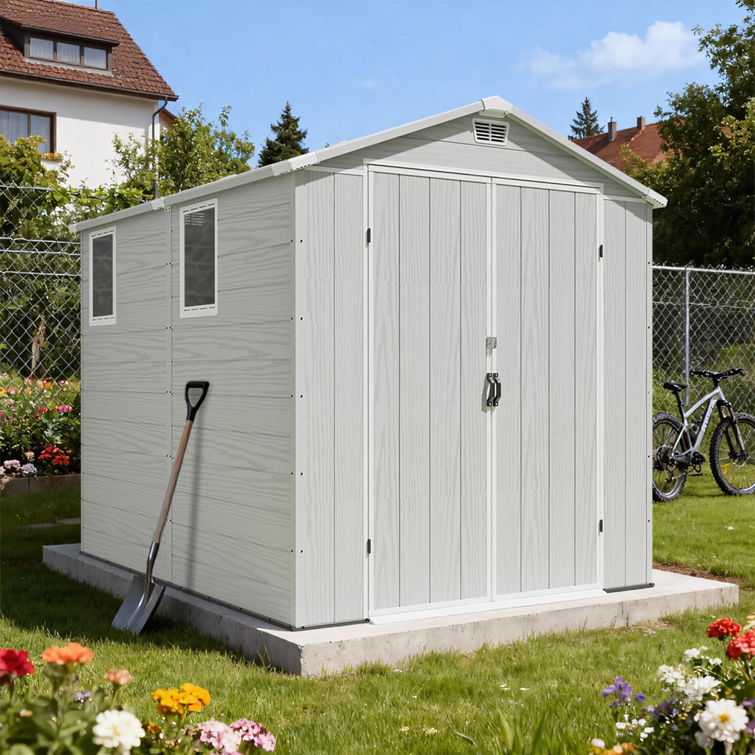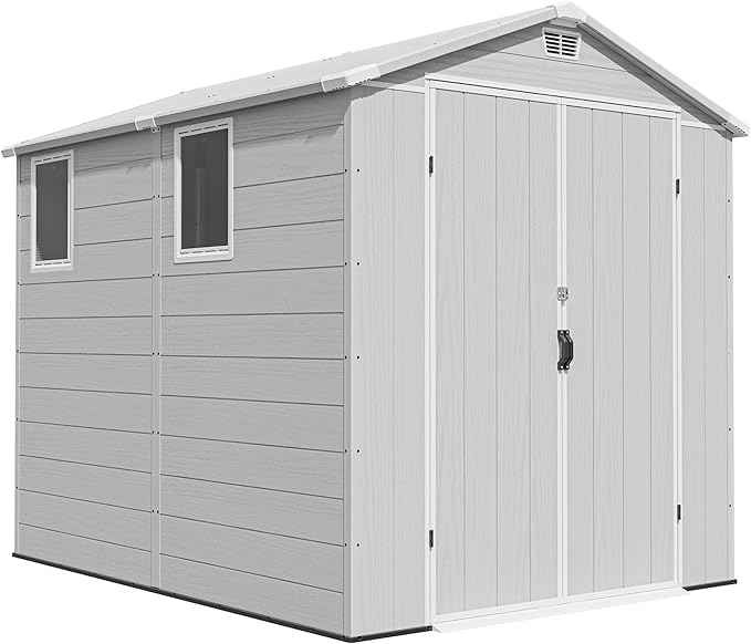 The? Pro-Tect Essential 6’x8′ Plastic Resin Garden Shed with Integral Floor – Light? Grey is designed to protect your valuables with a weather-resistant enclosure, shielding your items from rain, snow, and the elements?ideal for garden outdoor storage.
