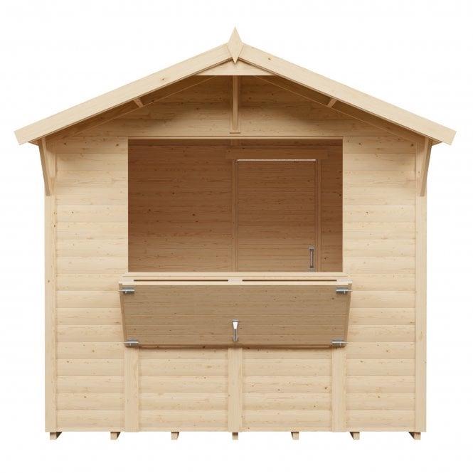 The Rowlinson 8′ x 6′ Timber Bertilo Loglap Market Stall Kiosk offers an attractive and versatile solution for outdoor retail or entertainment.
