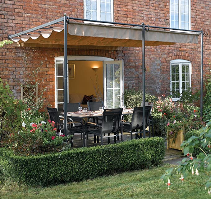 The Rowlinson Metal St Tropez 3.3m x 3m Canopy is perfect for hanging over a patio area or above your French doors. With a steel frame which firmly affixes to the wall, this attractive canopy offers you shade from the sun with a retractable showerproof canopy which can be removed for storage in the winter. The frame alone is a striking design, in a modern gunmetal grey and with stylish detailing around the top. With or without the canopy, this structure will be a stunning feature in your garden all year round and will add a little luxury to your outdoor living area. Perfect for dining al fresco, this canopy will keep sunburn at bay so you can enjoy your garden to the full.