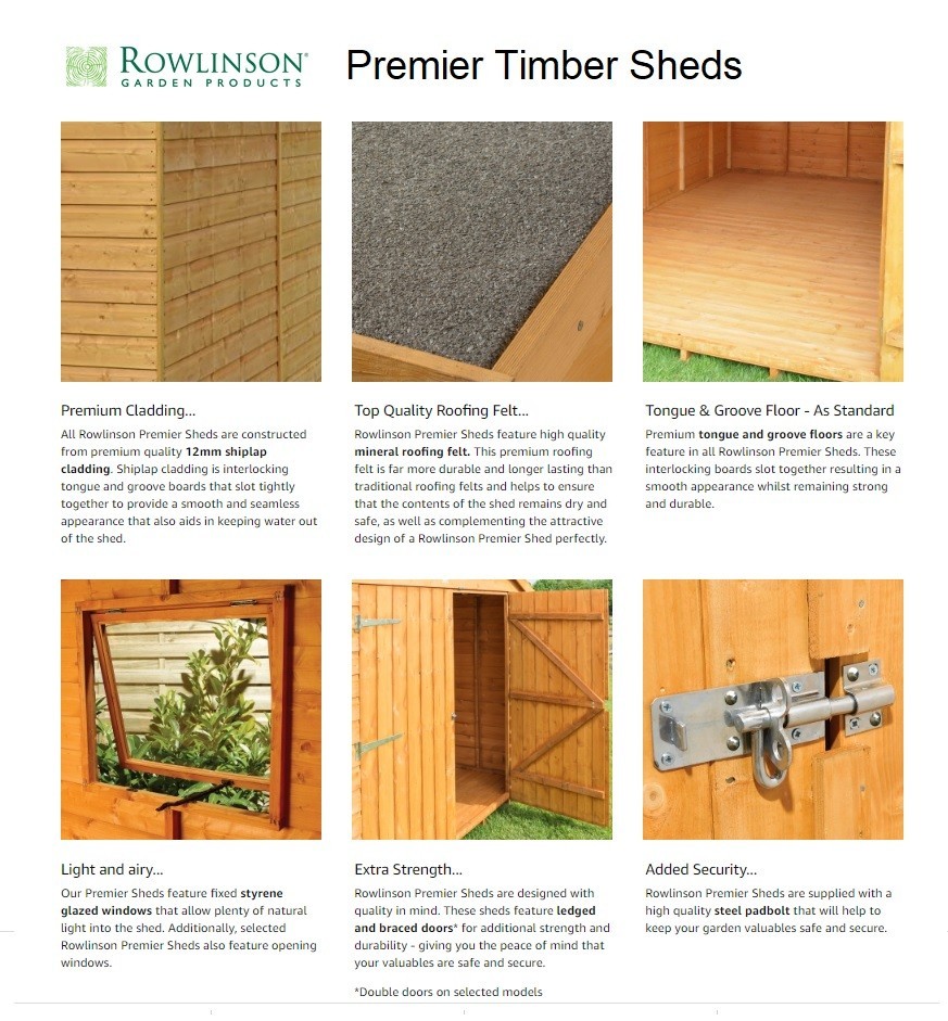 The Rowlinson Premier Shed Range is available in 5 sizes, so there is something for everyone! This shed is manufactured using superb quality FSC approved timber making this a very eco-friendly range. Featuring fully opening doors, styrene windows and a secure pad bolt for extra security (padlock not included).