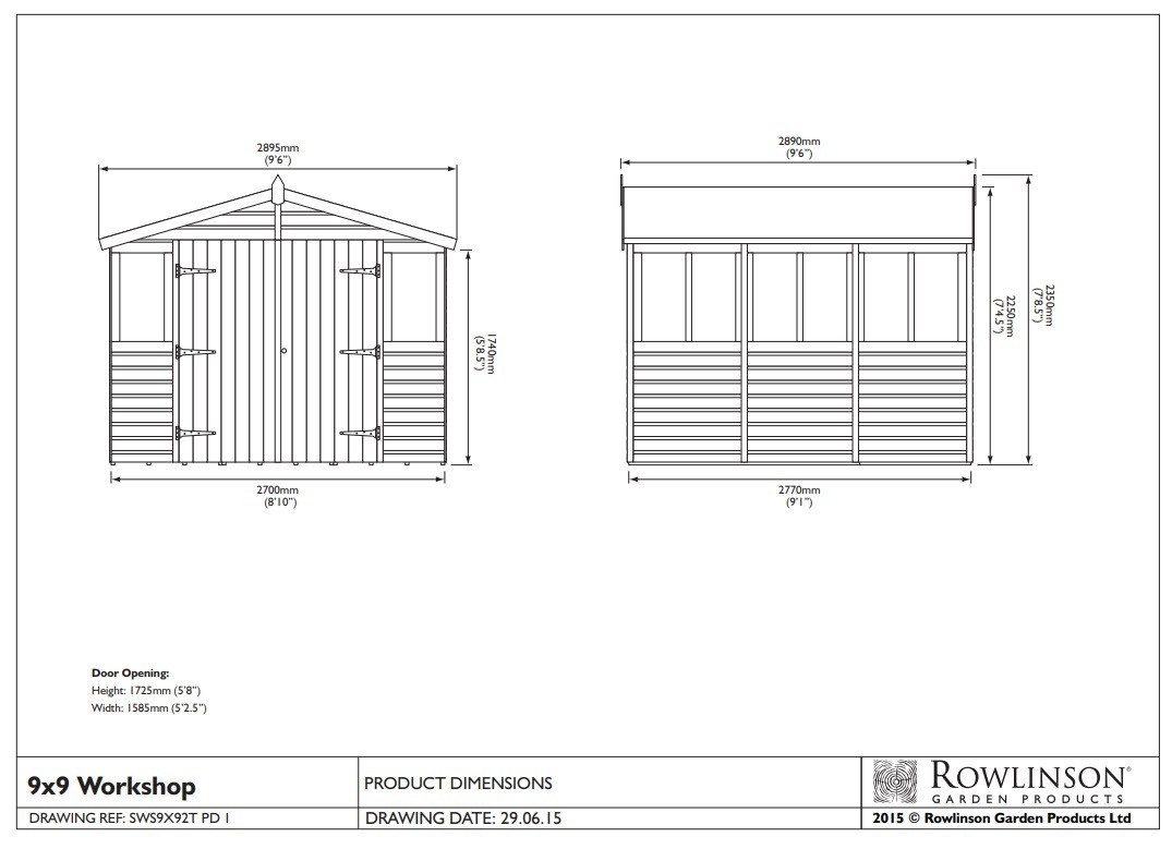 The Rowlinson Timber 9’Ă—9′ Apex Workshop has been manufactured from 29×35 and 29x45mm framing making it very strong and sturdy against the erratic weather. This impressive garden building features a 12mm tongue and groove flooring. The roof consists of solid board with a mineral felt cover for extra protection.