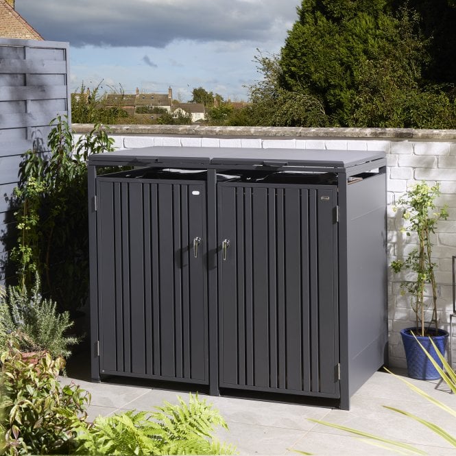 Ideally sized to hide away two standard 240 litre wheelie bins, the Wimbledon Double Bin Store is finished in a striking anthracite with vertical slats, combining style with practical outdoor storage.