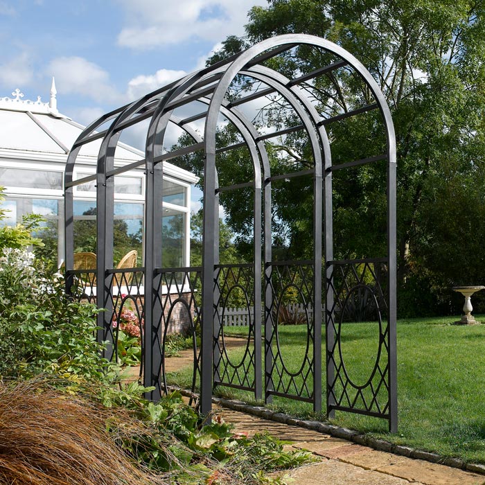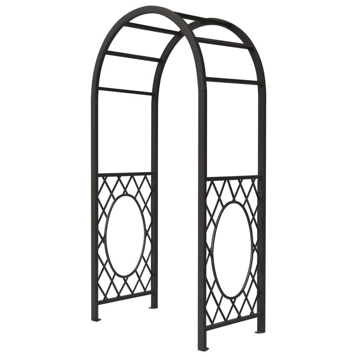 The Rowlinson Wrenbury Round Top Steel Arch is a modern and contemporary steel version of a classic garden arch. It features an attractive lattice detailing finished in a striking gunmetal grey. This powder-coated frame arch will give your garden a modern and classy feel.