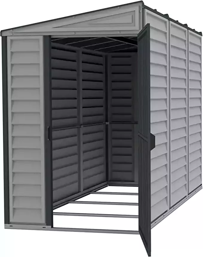 SAFFRON vinyl sheds are the highest specification lightweight garden sheds in the market. Apart from the high grade of PVC and steel, they have vents to allow airflow as standard. Each Duramax apex shed has pad-lockable hinge doors. One door features internal locking bolts allowing access to all your stored items through either a single or double door opening.