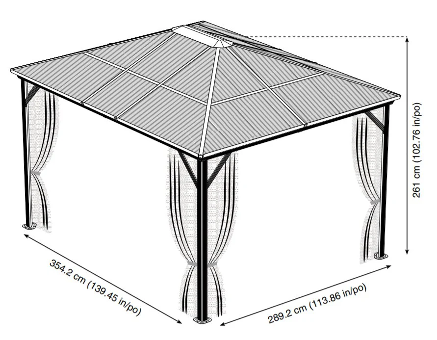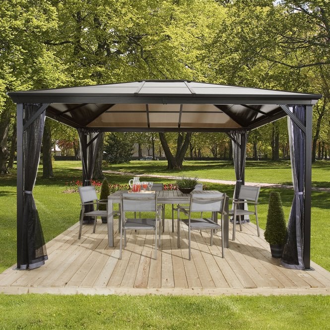 Enhance your outdoor setting with the Sojag Verona 10’x12′ (3m x 3.7m) Aluminium Polycarbonate Gazebo designed to stay up all year round.