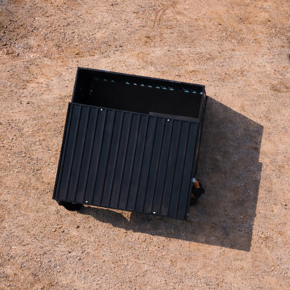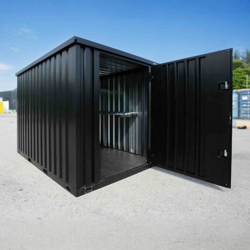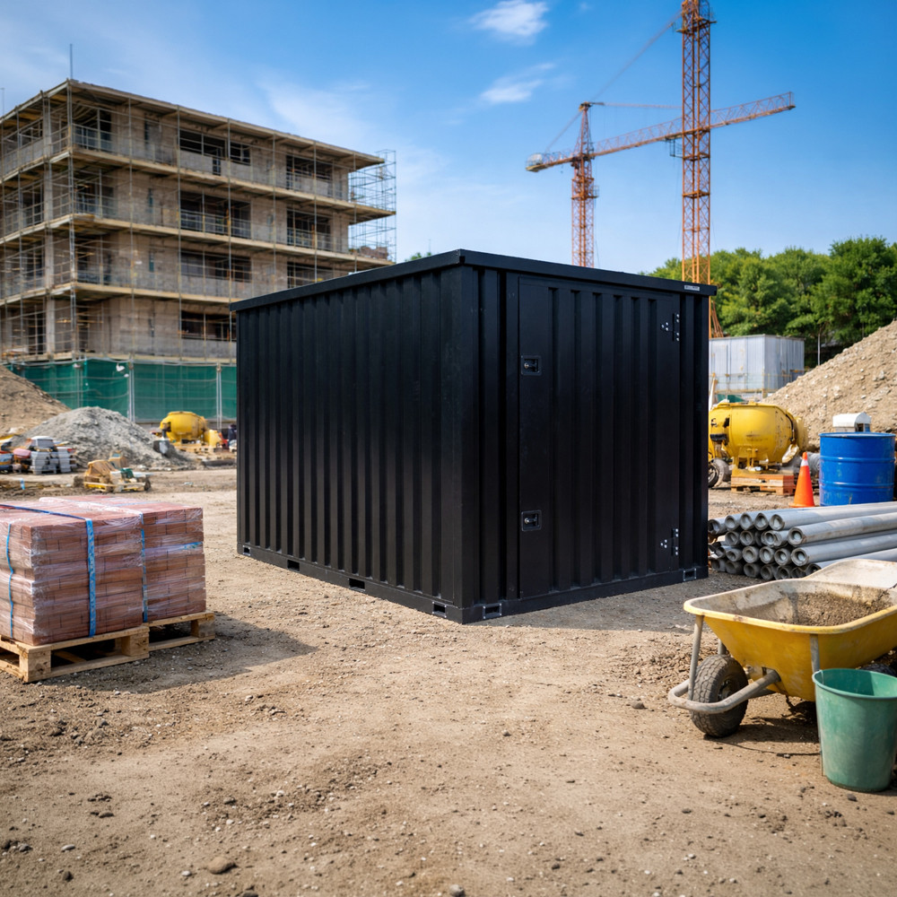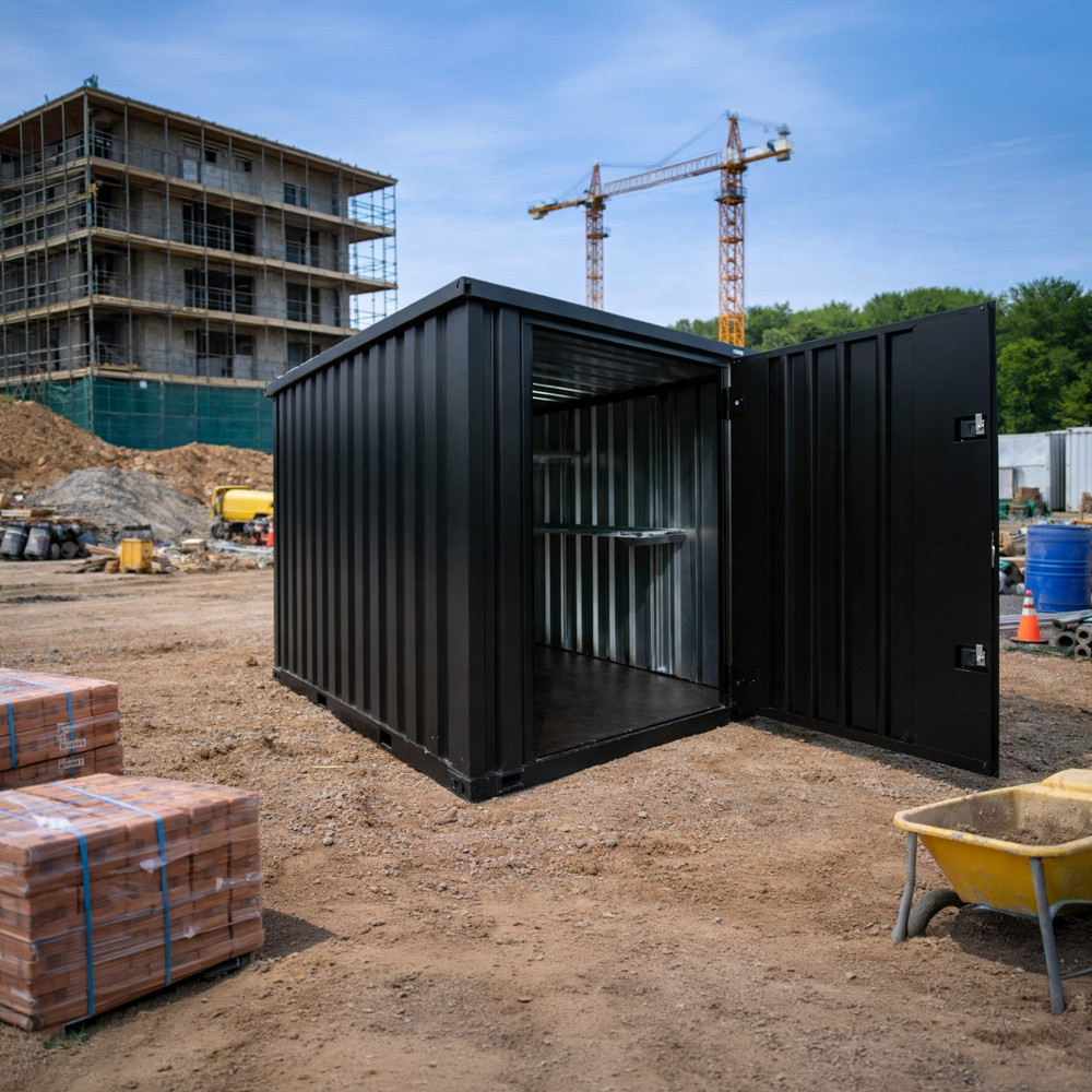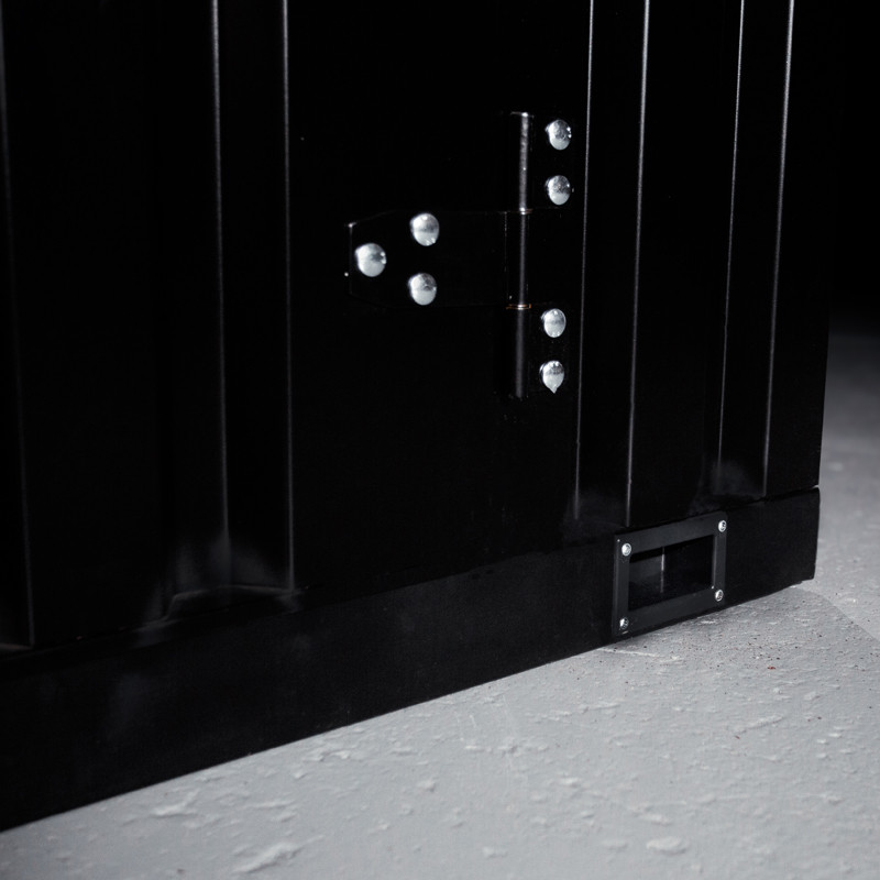 The storage unit is designed for maximum security and weather protection. Twin front T-lock doors are padlock-ready and equipped with heavy-duty hinges, while integrated ventilation panels prevent condensation and damp. An integrated gutter system efficiently channels rainwater, keeping the interior dry and safe. Finished in matt black RAL 9004, the SITESTORE® system combines practicality with a sleek, professional appearance.
