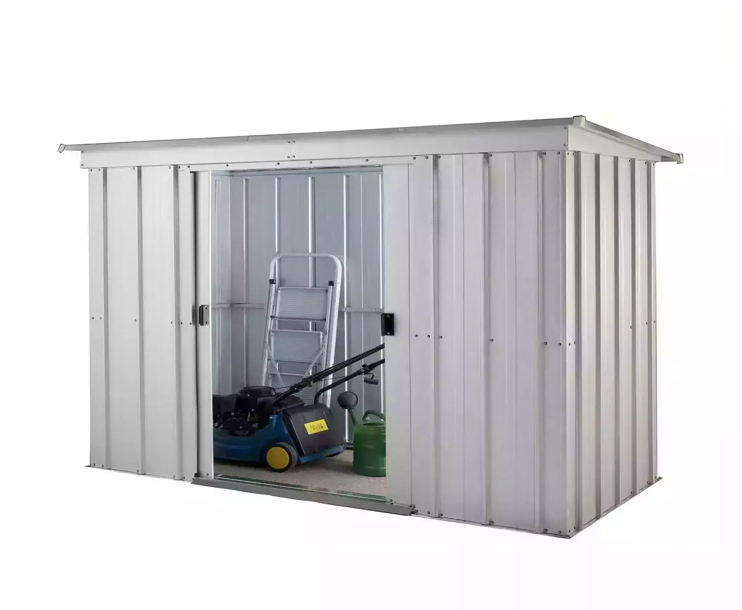 This metal shed benefits from standard features which include rust-free screws, a ventilated profiled roof and free anchor bolt fixings; to secure the shed to your concrete or paved solid base. The double door is of the sliding variety, being complete with handles holed to accept a customer-supplied padlock and an overlapping feature to keep the weather out.